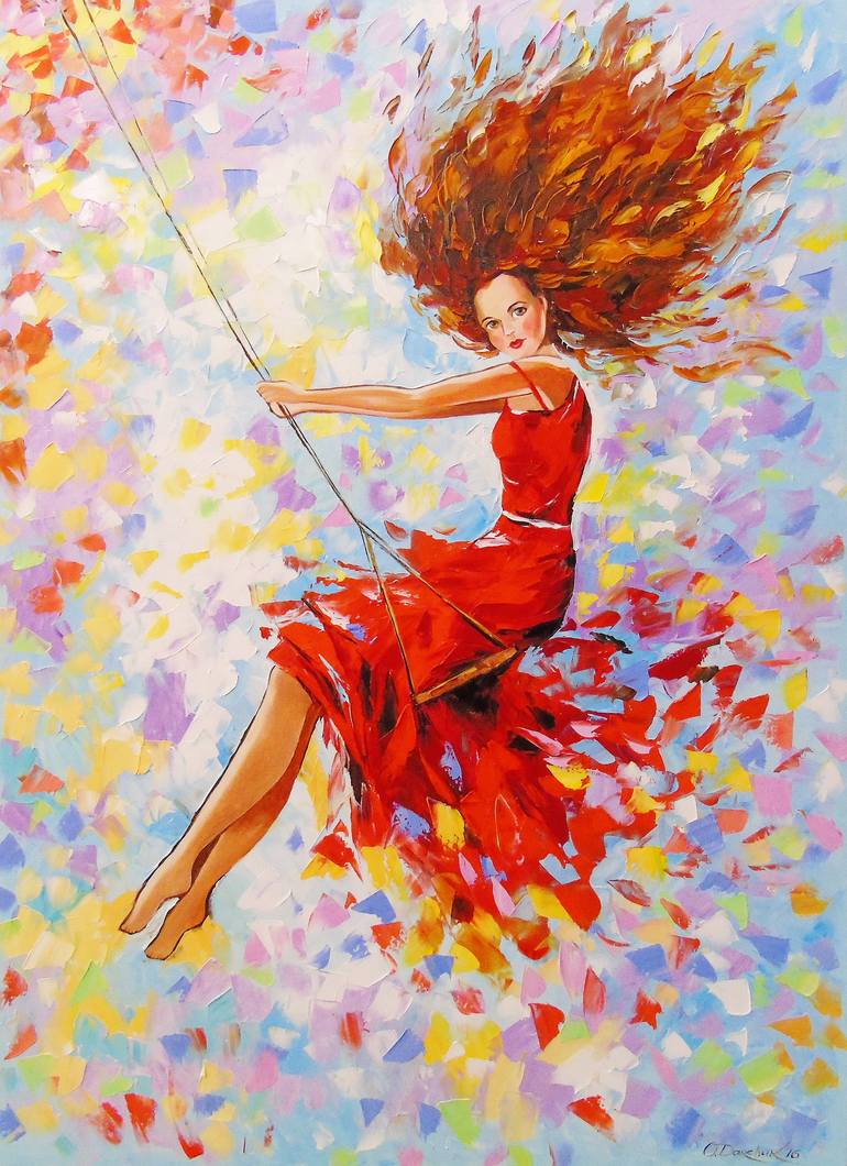 Girl on the swing oil painting on canvas without frame as edges are painted,100% handmade palette knife,decorate your interior and will give positive emotions to you and your family.Ready to hang. Girl,woman,swing,impressionism,oil painting.