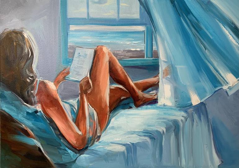 The girl just woke up and after a cup of aromatic coffee she noticed a letter from a loved one. Outside the window there is a beautiful view of the ocean and you can fully enjoy this beautiful morning