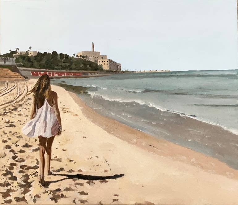 A girl is walking on the beach, Its morning and Jaffa is in the background. where will she go later?