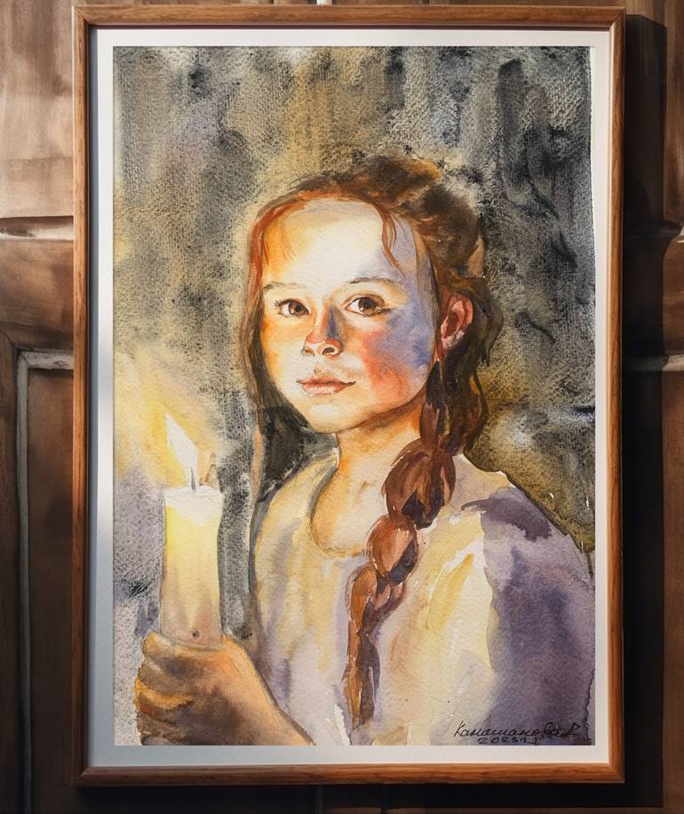 This exquisite watercolor painting, crafted on 100% cotton paper, portrays a young girl delicately holding a candle in her hands. The soft glow of the candle illuminates her face, creating an enchanting ambiance that evokes a sense of warmth and serenity. Aptly titled "Girl with a Candle," the artwo...