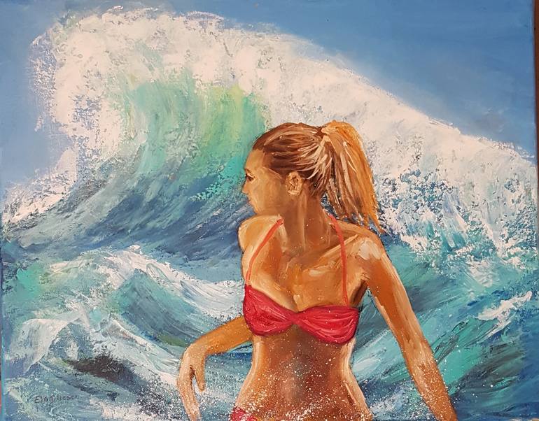 Girl with the waves little painting. Summertime the joy of life.