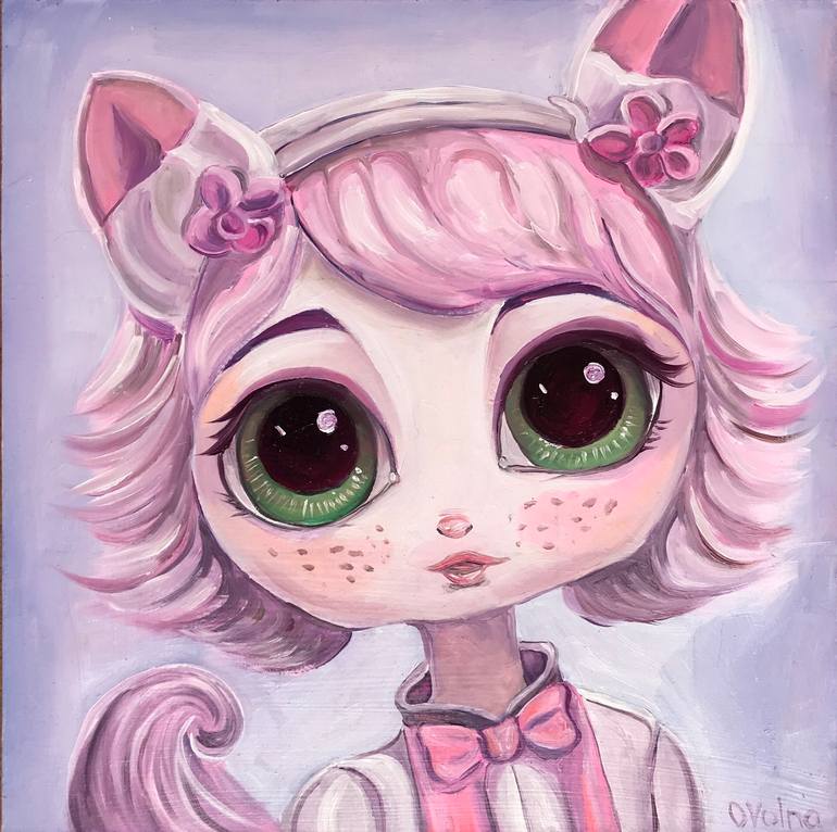 This small, adorable oil painting features a charming fantasy girl on a delicate lilac background. The painting is a masterpiece of whimsy and imagination, with the artist capturing the playful spirit of the girl with remarkable skill. The soft lilac background perfectly complements the girl, givi...