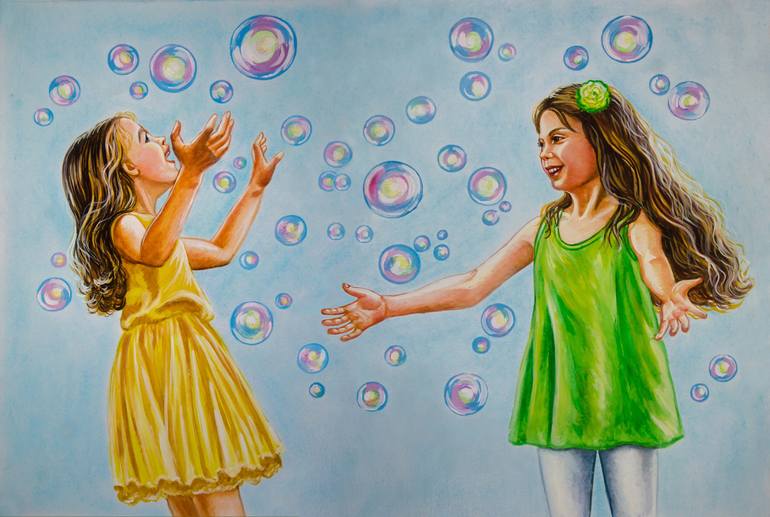 In this painting, I wanted to convey the pure, sincere joy of childhood — that lightness of being filled with laughter, play, and carefree moments. The two girls, surrounded by soap bubbles, symbolize openness and the magic of the present moment. I chose soap bubbles for a reason — they are fragile ...