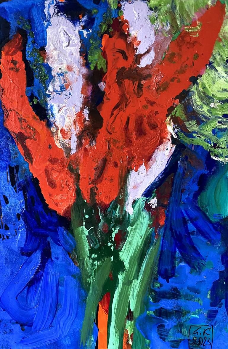 ARTIST: Anton Kovach TITLE: «Gladioli» MEDIUM: Acrylic On Canvas YEAR: 2023 DIMENSIONS: 70 x 45 cm / 27,6 x 17,7 inches WORK: Modern, Contemporary, Abstract Art COLORS:, Blue, Green, Red, White DESCRIPTION: This abstract acrylic painting captures the essence of a floral bouquet, featuring gladiolus...