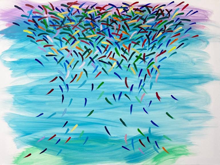I was thinking of women's fight for equality and empowerment and felt the need to create a social statement. 'Glass Ceiling' is an abstract expression to animate women's challenges with bold, vibrant brush strokes moving upwards and bouncing off or pushing through the top. All against a broad-br...