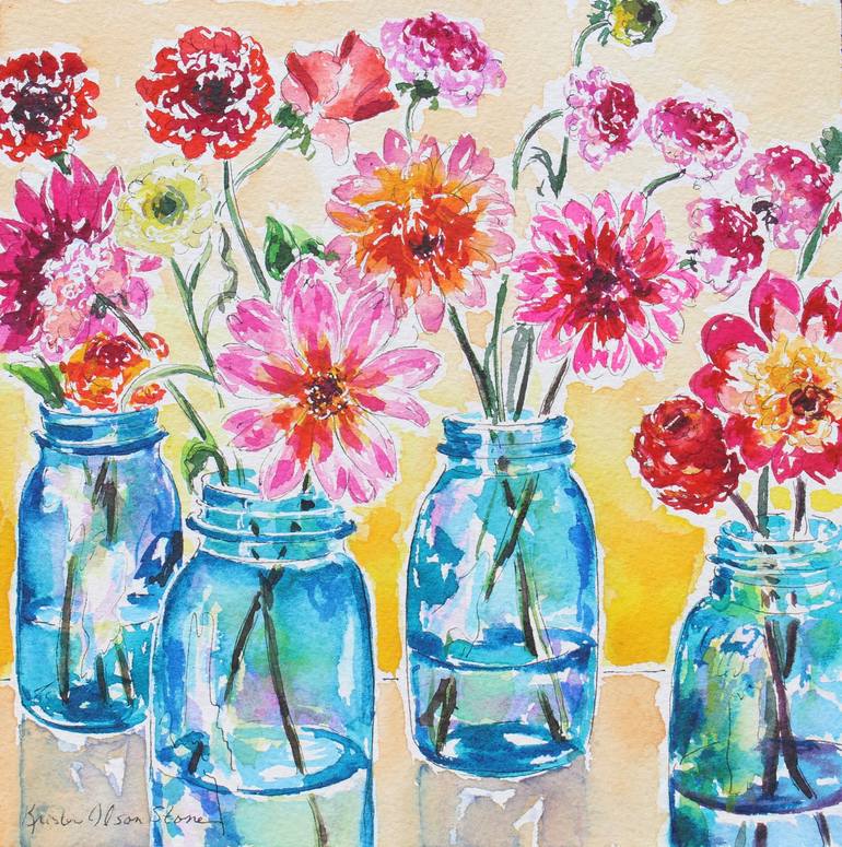 Glass Garden is a cheery, colorful original painting will make you smile! Brightly colored dahlias in classic teal vases in front of a bright yellow wall. This is a bold, contemporary, beautiful floral composition! An original 7.9" square or 20 cm square watercolor painting on Arches 300gsm all cot...