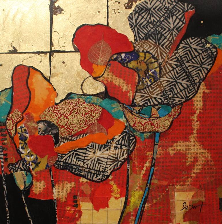 From my bold floral series in 2021 -2022, "Glass Poppies" is a dramatic 24" x 24" and is framed in a gold wood floater frame is ready to hang. I love textures and make many or my own papers for this type of painting. Creating many stamped papers and file them onto a studio shelf to apply when a piec...