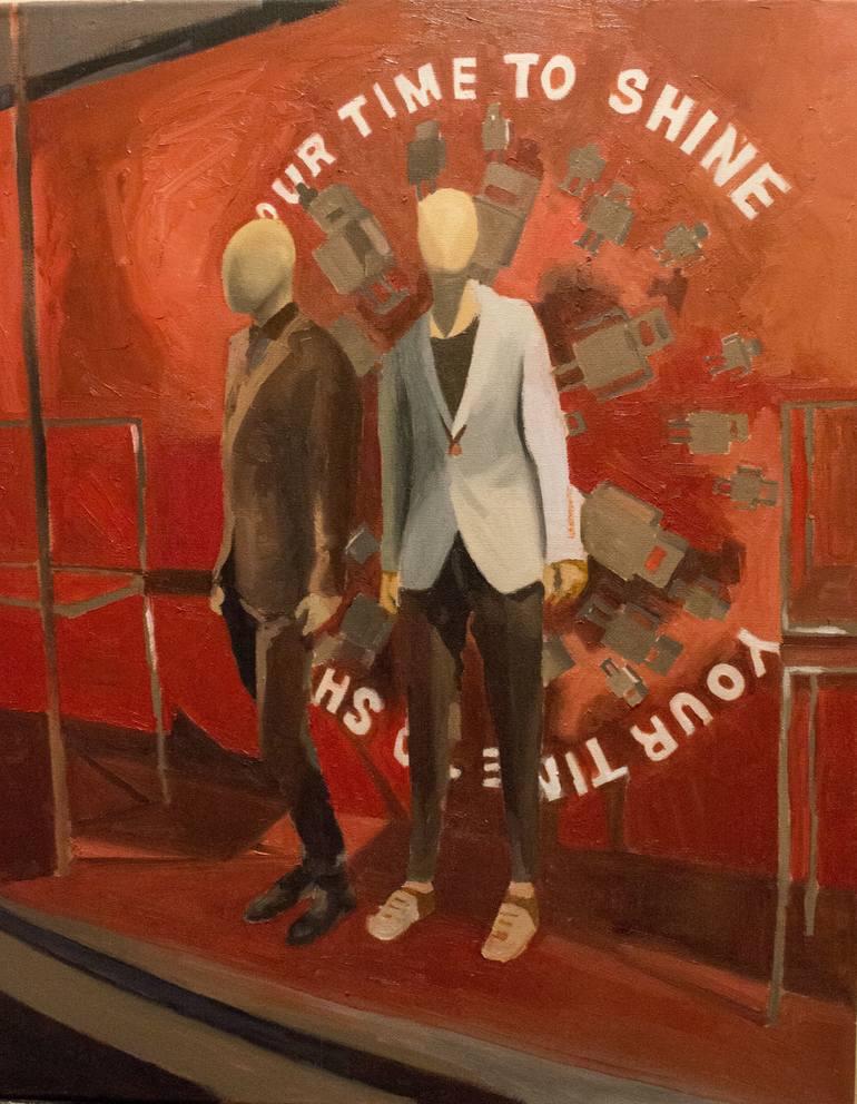 Step into the realm of modernity with a captivating painting that depicts two enigmatic men adorned in sleek suits. Their countenances, intentionally unrecognizable, hold a magnetic allure as their gazes lock with yours, inviting you into their enigmatic world. Through this artistic marvel, the boun...