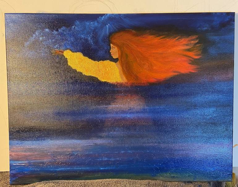 I usually paint women with dark hair. I was inspired to represent the beauty of the ginger spiced locks! Looking for inspiration I researched Deities of Ireland. Reading the story of Airmid drew me to create her floating in the heavens. As the tale goes, her father killed her bother Miach. Airmid w...