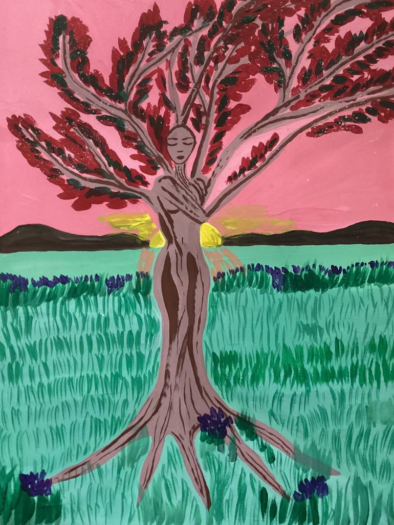 "The Goddess of Trees" is a mystical gouache painting depicting a calm yet powerful nature deity. Earthy tones and flowing brushstrokes create a sense of harmony between the divine and the natural world. Her presence exudes feminine energy and spiritual connection, as if she is breathing life into t...
