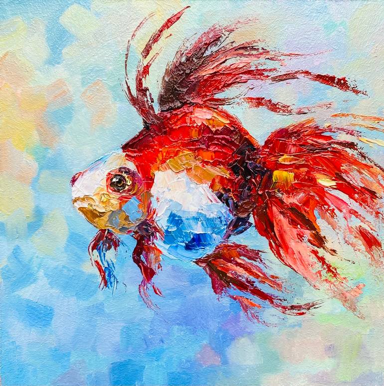 Fish Painting Gold Fish Original Art. 100% original hand painted fine art one of a kind Title "Gold Fish" Size 8 х 8 inches (20 х 20 cm) Colorful textured Gold Fish painting would be a great addition to your heavy texture oil painting collection. The texture and strokes can be seen in the close-up ...