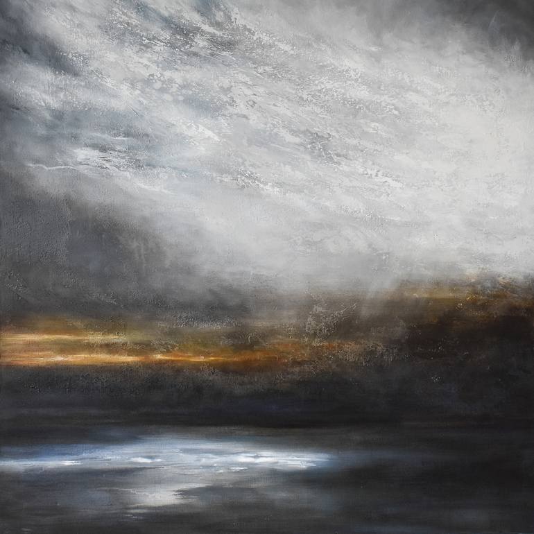 A gold lining above the horizon with a dramatic sky above. Standing on the beach at the end of the day. That is what was in my head while painting this. The sky was painted by partly pouring the paint across the canvas and using a pallet knife to help spread the paint. I sometimes let the paint do ...