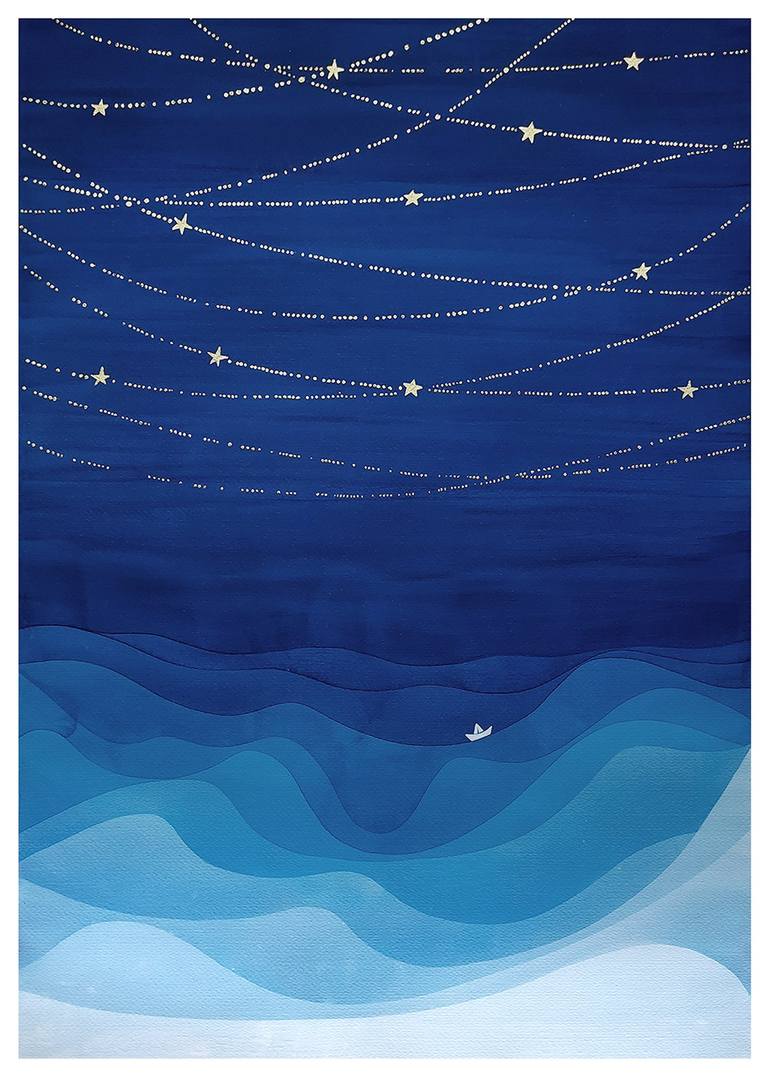 Blue artwork on paper. Dimention 19,7 x 27,6 inch. Painting depicting a lonely little boat on a rough ocean at night. In the sky, stars form garlands made of real 23 3/4 carat gold leaf. White border 0,4 in included in size.