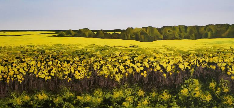 The painting is currently on exhibition and will be available for shipment after March 26. The "Golden Canola Field" is an acrylic painting showcasing a vibrant yellow canola field in the foreground, set against a lush green forest in the background. Created using a combination of acrylic pouring a...