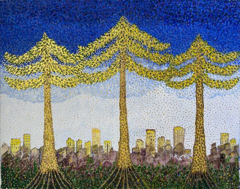 A symbolic image of the new experience of the new world in the form of the Golden Cedars, growing through the old and obsolete. The picture is made with acrylic paints on canvas.