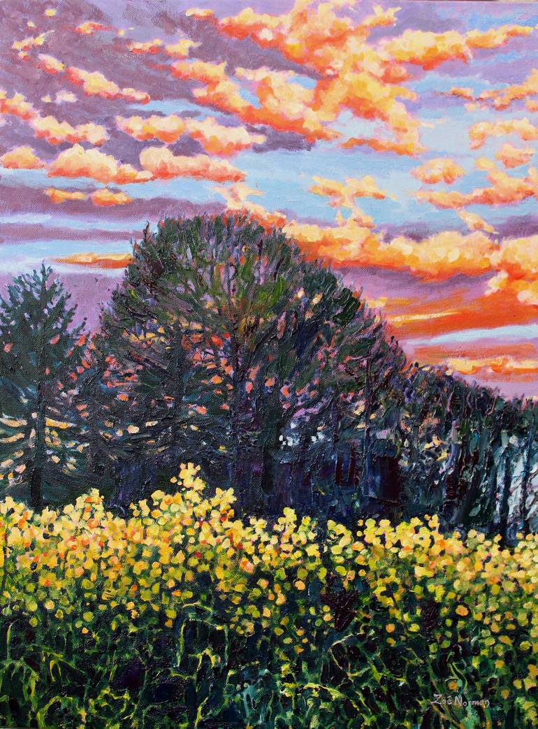 Contemporary Impressionism An evening walk through Norfolk rapeseed fields inspired was the inspiration for this dramatic oil painting. The artist has used thick impasto paint in an expressive style. Signed on the front and accompanied by a certificate of authenticity. The painting continues aroun...