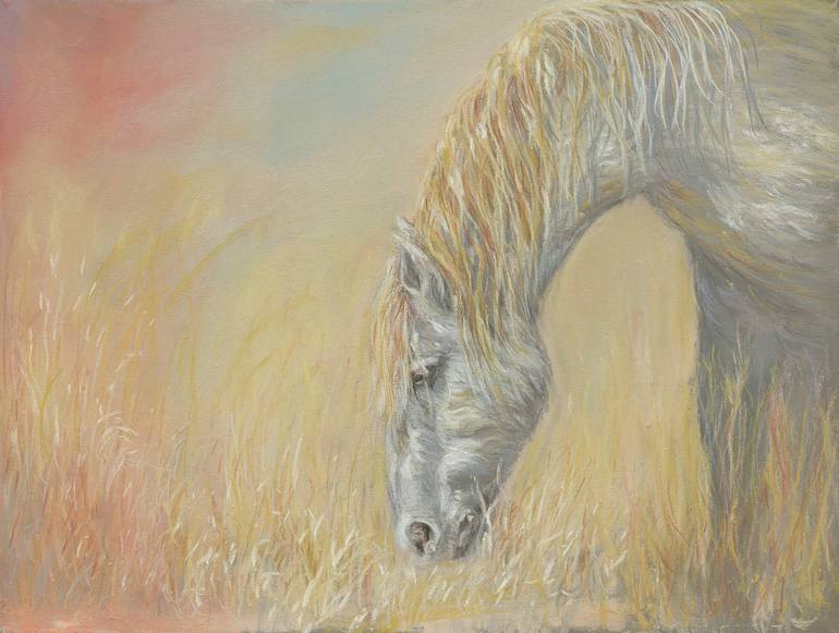 Beautiful serene pastel on paper depicting a horse in a golden pasture. Pastel on paper is the perfect medium to show the bright gold and yellow colors and texture of the horse. Pastel is based on a Clydene Spencer Forbush photo. 10% of proceeds will be donated to Sweetbeau Horses, a charity de...