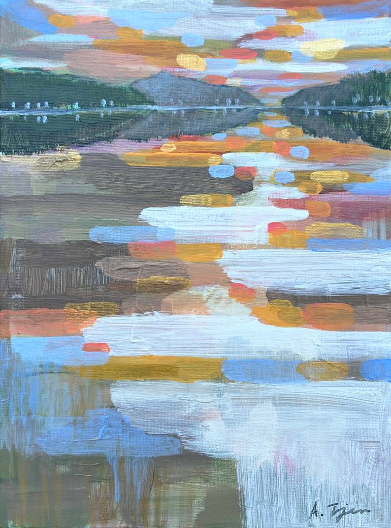 This semi-abstract lakescape is inspired by the colors of summer. The waters of the lake dominate the foreground, creating a sense of depth and perspective. The reflection of the sky on the surface of the water is a juxtaposition of intuitive, loose abstract shapes, capturing the essence of the whim...
