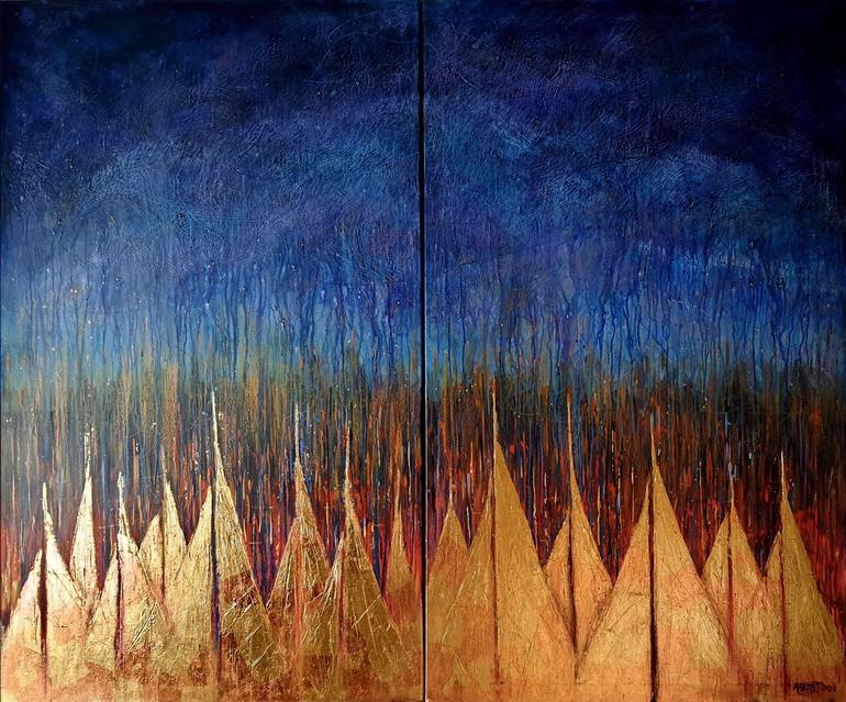 (diptych,each side :150x90cm.) Linen canvas, oil, acrylic,potal,oil pastel. 150/180 sm. 2022. The sea the sea the evening the warm air the contemplation. the old boat. the boats are near. they are resting. gaining strength. the sea the light breeze. Sea Sea and sky. The sky is like the sea. An...