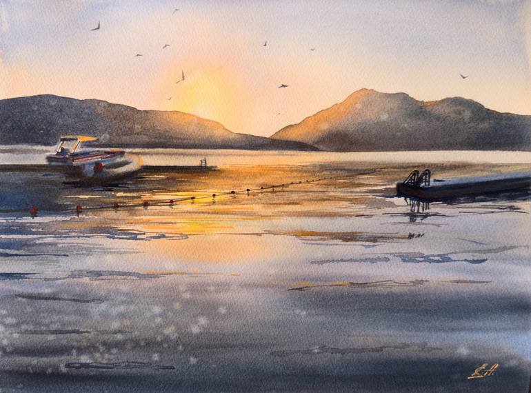 This original watercolor painting captures the golden serenity of a seaside sunset. Soft warm light reflects on the water's surface, gently illuminating two boats and a peaceful pier. The surrounding mountains fade into the horizon, creating a dreamlike, tranquil atmosphere. Perfect for lovers of t...