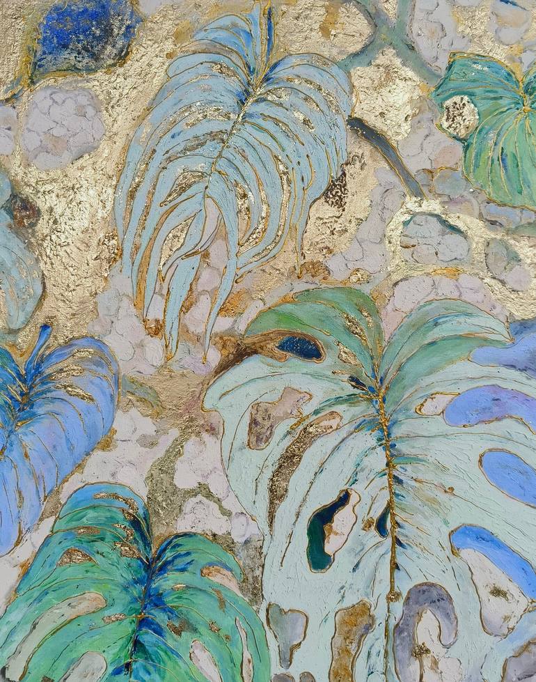 A serene and luxurious portrayal of monstera leaves with soft blue and green hues, accentuated by golden highlights. The textured background and gilded details evoke a sense of elegance and nature’s richness. This piece beautifully captures the timeless charm of tropical foliage with a touch of opul...