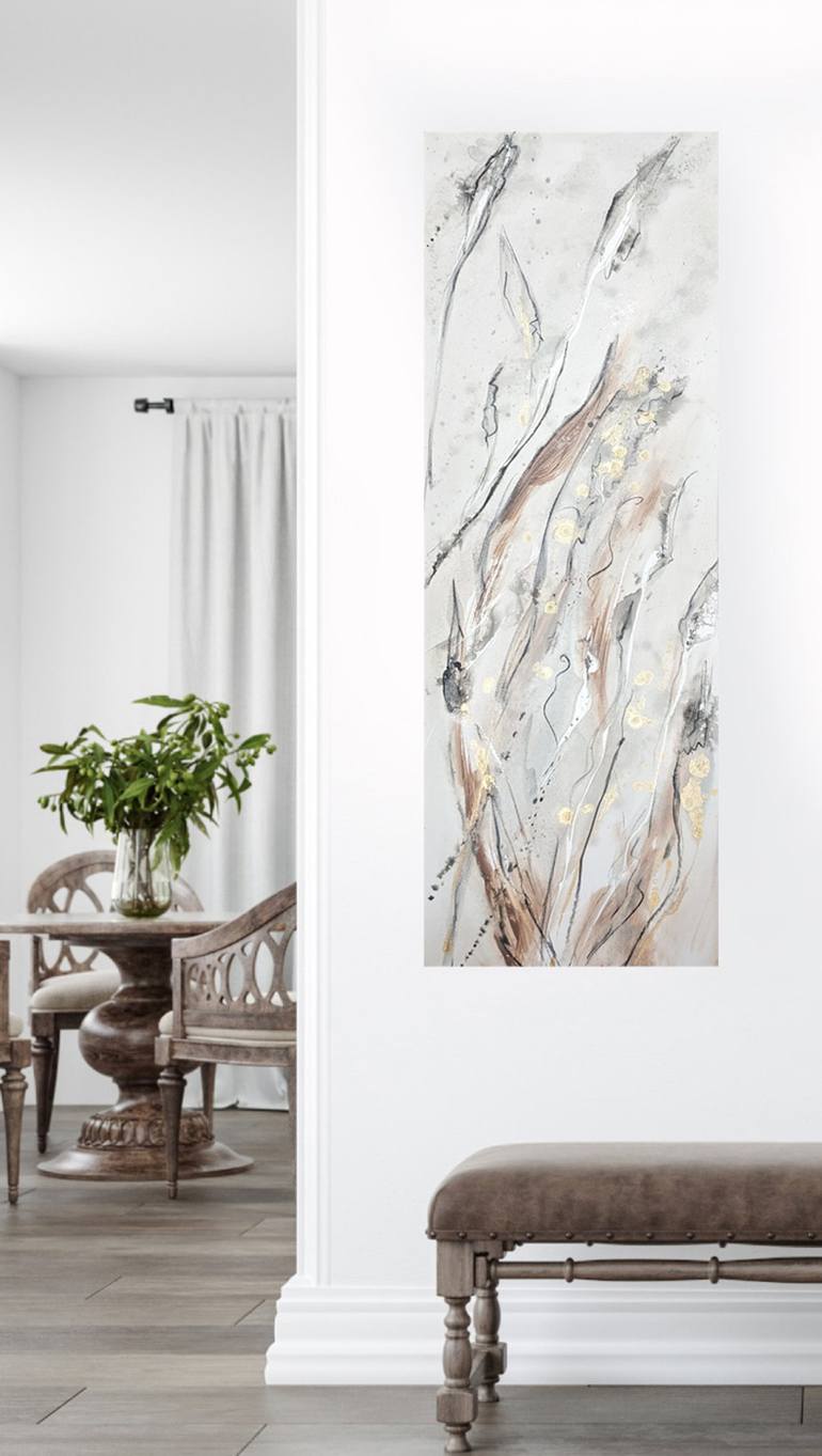 Golden Windswept Dune Flowers is a peaceful study of wildflowers with hints of metallic gold gilding. Using a light mocha, warm greys andd deep brown black on a background of warm brown, beige and white. The accents of metallic gold cover the entire artwork - it changes and shimmer in the light The...