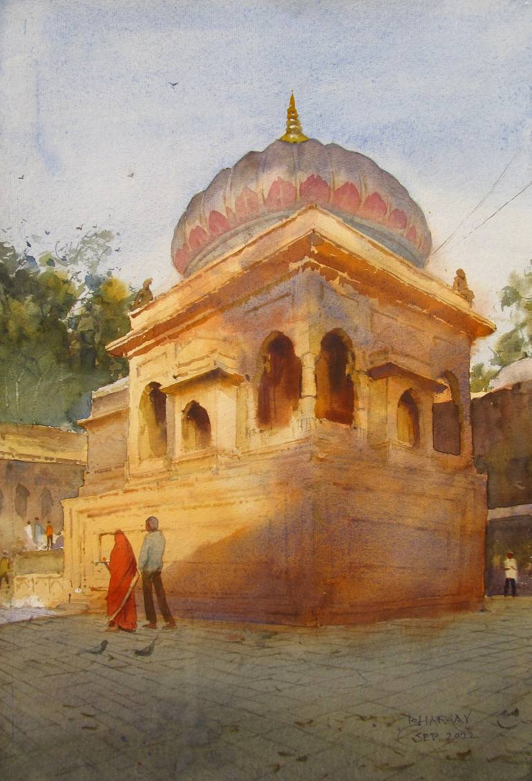 This is inspired by Memories of Maheshwar, MP,India. This city has rich history, Beautiful Ghat, Old temples, cultural vibrancy. Inspiration for the artist. Done in watercolour on paper, shipped with authenticity certificate.