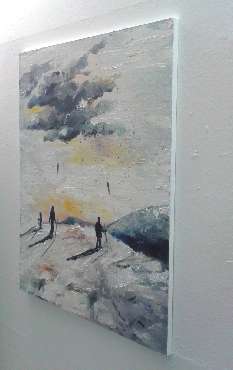 Tanja Vetter’s works show painting as alienation of a reality, where representational and abstract elements are imbued mutually with each other. Landscapes are her motif. Tanja Vetter’s countrysides of wood and mountainscapes, seascapes and staffage landscapes meet our eyes discomfortingly, melancholically and alienating. For, in spite of the closeness to the portrayed, unreal looking traits blend into the open spaces of the sceneries, make their way from tangible motif through its decomposition to the point of abstracted colour patches, warm and cold tinting colour gradients and surface structures. It is not the artist’s aim to depict nature, rather her landscape impressions shape themselves from painting; nature takes place in the process of painting. Her artistic repertoire ranges from expressive brushstrokes to dripped and blending oil paint; over and over the depth of space is sought after and penetrated by the autonomy of colour. In addition human figures in wide, sublime scenery; particularly the latest works include the figure, man into the colouristic landscape areas. These can be of quite symbolic nature and ask questions for the seemingly long gone desire and broken longing for the unity of man and nature. They let us discover and experience them again. Tanja Vetter gratuated in 2002 from the Freie Kunstakademie Mannheim, Germany. Her work has taken many turns in recent years: from abstract informal art to realistic painting – often broken by ironic elements and exploring its means and possibilities by itself.