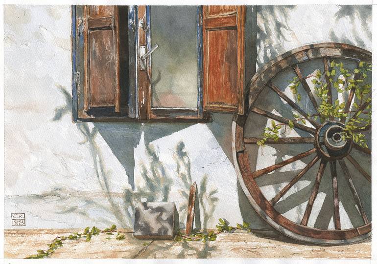An old wooden wheel leaned against an old farmhouse. The sun has warmed the wood, the shutters of the window are closed