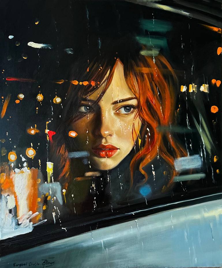 In this painting, I sought to capture the raw, unfiltered emotions of a fleeting moment. Through the oil medium, I express the contrast between the serenity and turbulence of urban life, as seen in her gaze. The vivid play of light and shadow on her face, magnified by raindrops on glass, mirrors the...