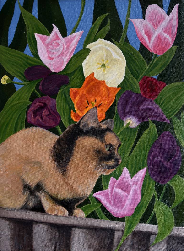 A painting of a cat which sits outside my window, whom I named "Gorgeous".