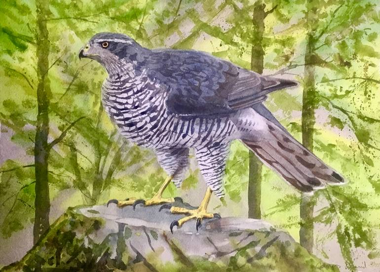 Northern Goshawk perched on a rock in a forest of beech trees. Painted on Arches watercolour paper (which has a textured surface finish) with Winsor and Newton paints. Sold without mat/mount or frame. Painted to the edge of the paper.