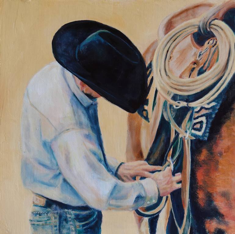 Realistic oil on linen western fine art painting of cowboy cinching his horse, meaures 10 X 10", unframed. Sold unframed