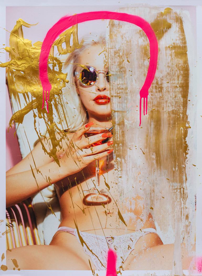 Remember "Lolita" by Nabokov? Playboy-Model Amber comes close to the described young woman from the book. Maybe the photo looks like an old retro-issue from playboy - the overall golden and pink colour gives it a complete street-artish look and feel. Holy Grafitti meeets art! Due to working with fl...