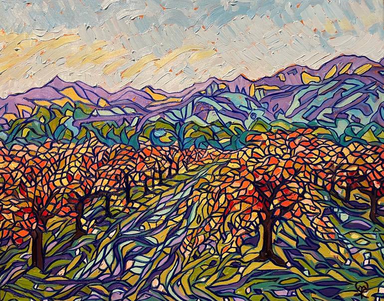 Vibrant colors and bold swirls form a depiction of a landscape with rolling hills and a row of blossoming vines. The sky transitions from soft hues to striking contrasts, highlighting the lively energy of the scene.