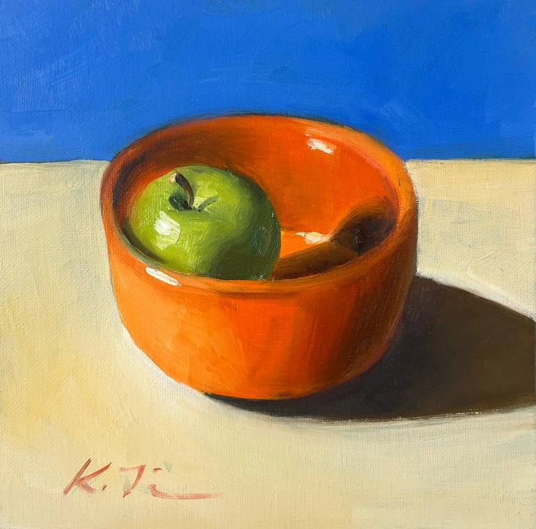 Original still life oil painting on canvas. Traditional oil painting of still life with green apple in a bowl in realistic style with impressionistic elements. *Title: Green apple *Size: 8 (height) x 8 (width) x 0.2 (depth) inches *Materials: Oil paint on wrapped cotton canvas *Style: Realistic, Fin...