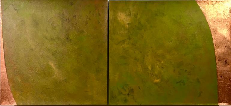 Green Copper Curve diptych is a painting on two canvas' on 3 inch thick stretchers. Its surface is painted with many layers of acrylic paint. Parts of the canvas and sides of the painting are covered by copper leaf. The reflective quality of copper leaf bounces off the warm light onto the color of...
