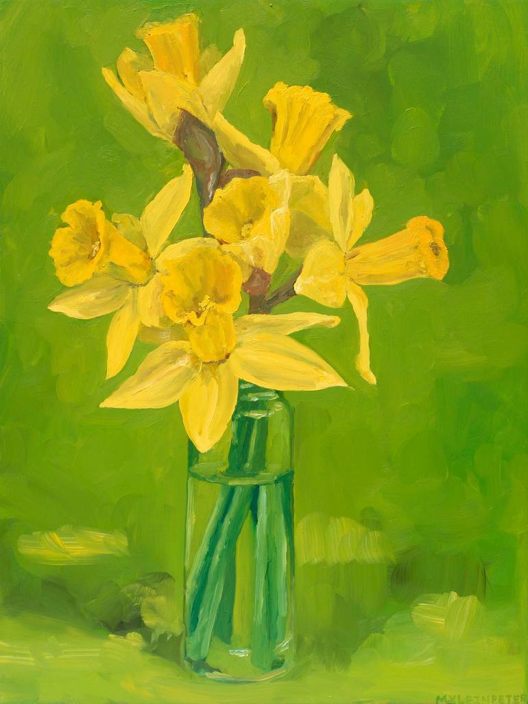 I am trying to make lovely paintings that come together and fall apart as you look at them. All of my still life paintings are made from life. I paint wet into wet moving the paint around on the surface as I work.