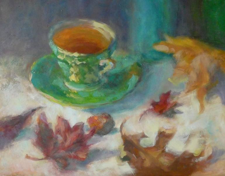 Every afternoon I pause and take a break with a cup of tea, and sometimes a cookie. How lovely the tea is, how lovely the various cups and teapots! So of course I had to paint this moment of tranquility and beauty. I chose oil paint to designate that the tradition of tea drinking is quite old and v...