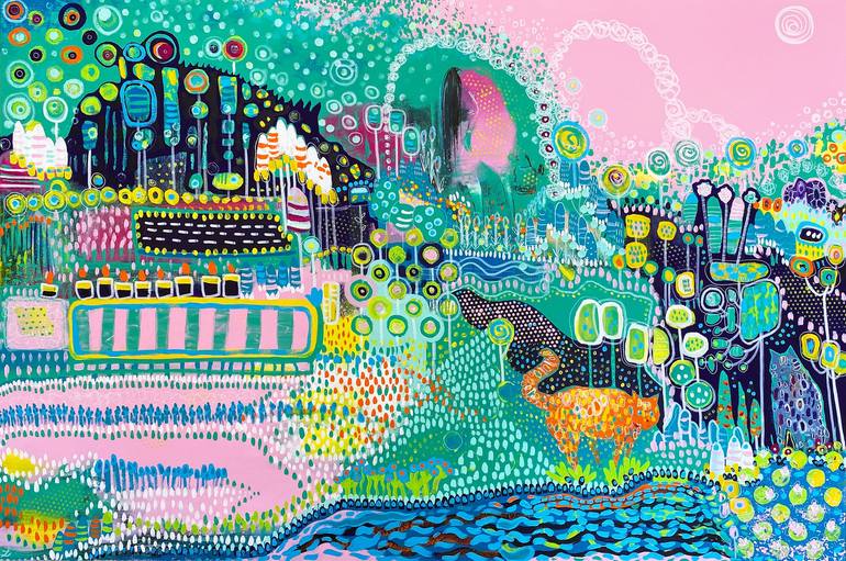 In the secret garden. This artwork will create a great Feng Shui art element in your home. This large impressionist painting with semi-abstract elements is made in a colorful unique style with a beautiful texture. It features a lush, secluded garden, full of mystical creatures, plants and flowers, ...