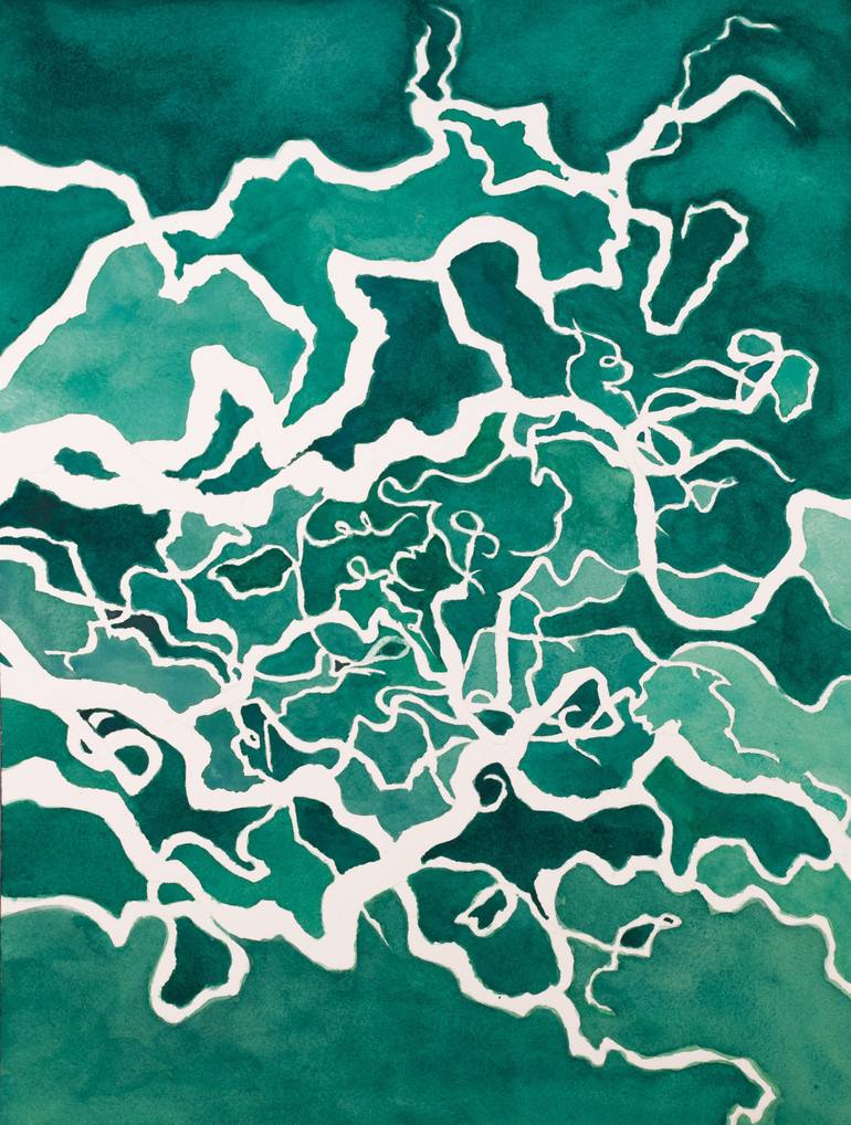 White vines twist around in a complex maze in a green forest. The image shows an abstract artwork with a network of white, vein-like lines against a rich green background. The lines are organic and interwoven, resembling a topographical map or a branching river system. The lines vary in thickness, ...