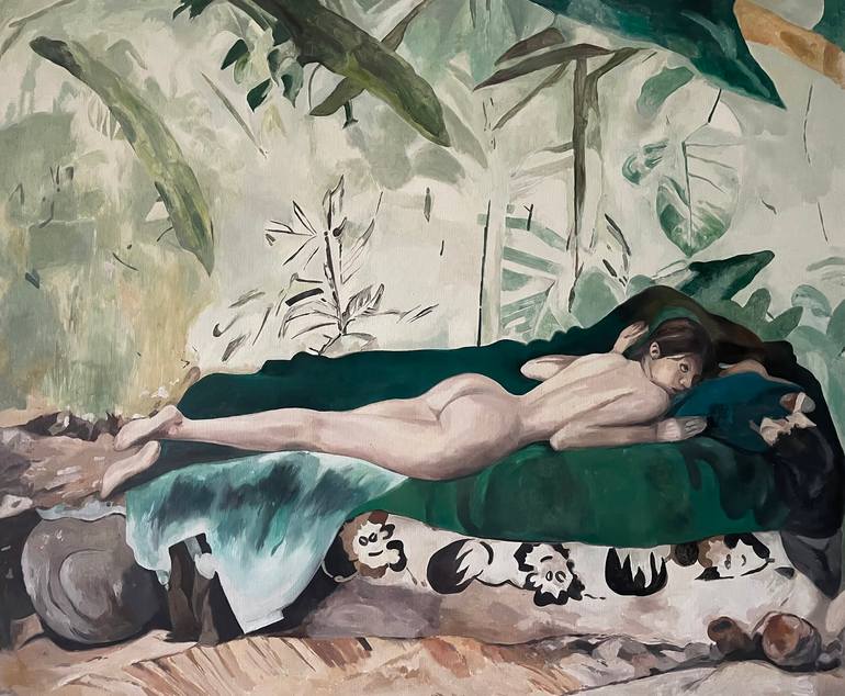 This oil painting captures a reclining nude figure, enveloped by lush tropical foliage, merging human presence with the untamed beauty of nature. Inspired by the timeless tradition of the reclining nude in art history — from classical odalisques to modern reinterpretations — this work invites the vi...