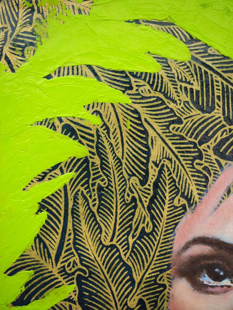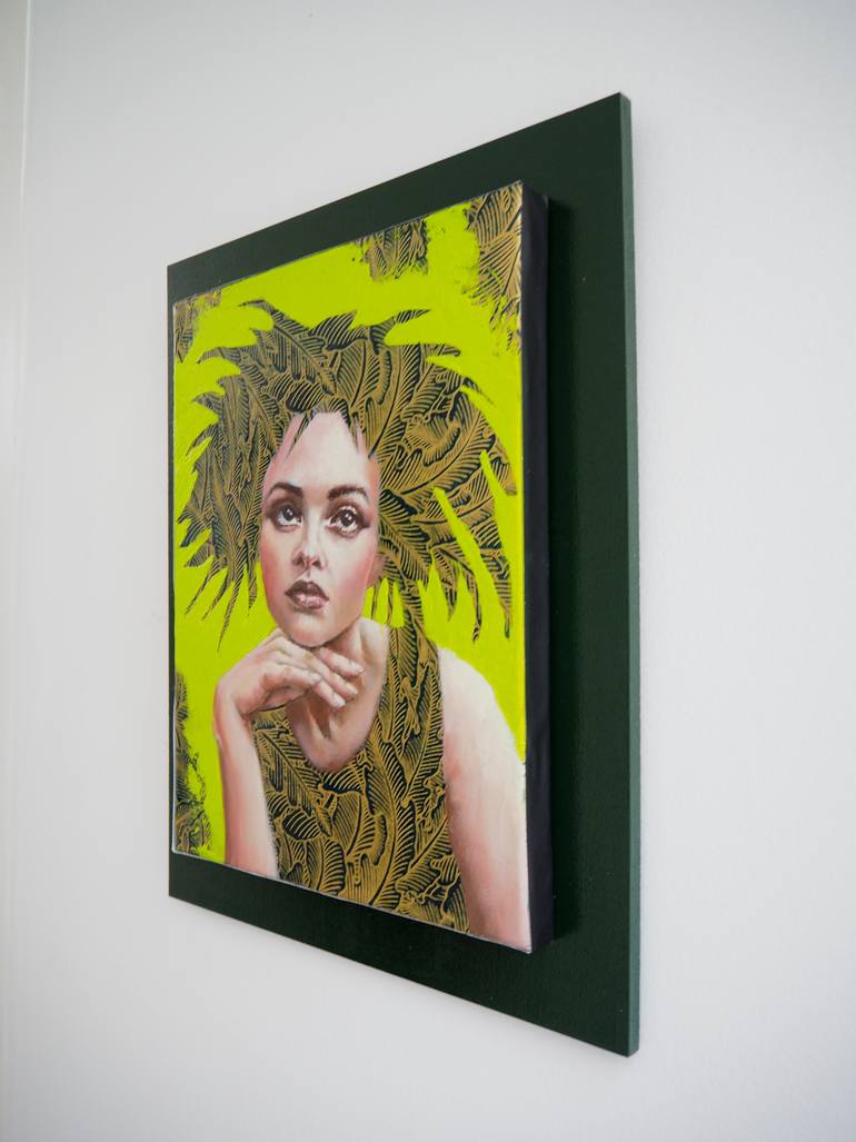This captivating work presents a striking portrait of a woman against a bright green background, whose extravagant hair evokes plant or leaf motifs. The meticulous details of the leaves on the dress and in the hair, finely traced, create a harmonious contrast with the delicate complexion of the face...