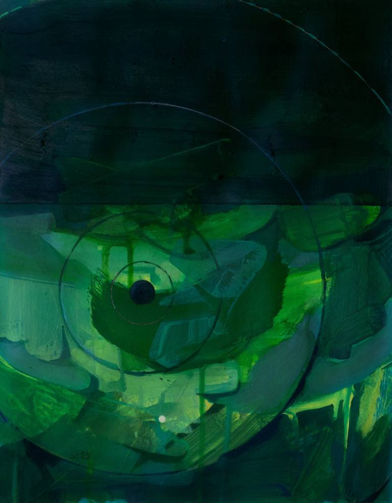 Dark and brooding, "Greens 5" continues the trend toward complexity within each color group. This painting is part of the series "Spontaneous Deliberation". This work was produced on bristol board, and is meant to be matted and framed under glass or acrylic.