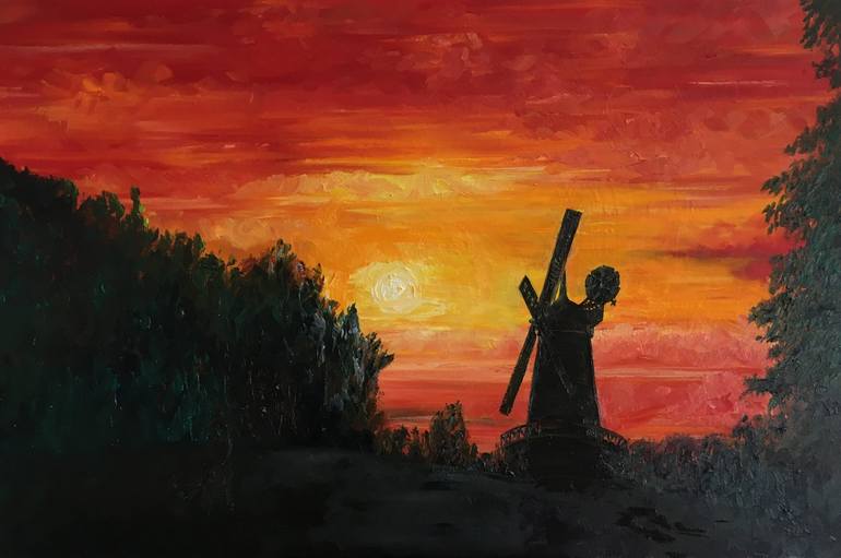 An impressionist painting of a stylised sunset behind Greens Windmill, Sneinton, Nottingham England. Green's Windmill is a restored and working 19th century tower flour windmill converted in to a science centre. The painting is painted with high pigment Rembrandt and Micheal Harding oils and finishe...