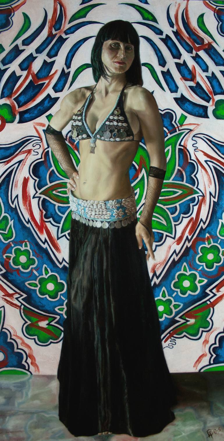 Oil on linen 120x62x2cm (47.3x24.4x0.8in) 2015. SOLD. Private collection, Paignton, UK Greta is a belly dancer who became a friend of mine while talking about her exhotic passion. Suddenly I asked her to pose for some shots in her dancing costume. This is the result of my work on the photoes we mad...