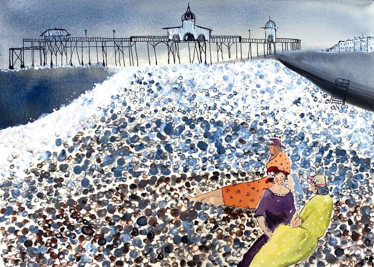 A larger version of grey day on the beach by the pier illustrating a small group of ladies and distant pier. Expressive style in loose fun manner to depict one of those ordinary days by the sea. Painted on good quality tinted watercolour using a little gouache with mostly watercolour and ink. Mount ...