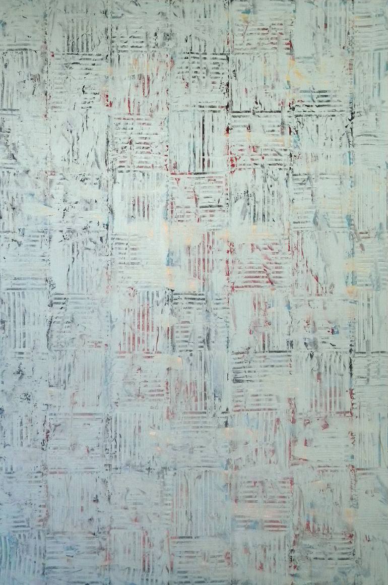 This is a large, abstract, textured, multi layered painting with blue green grid over colors of blue, red, yellow, black and mauve. Can be hung vertically (portrait) or horizontally (landscape). Painting is on plywood which is backed with a timber support frame. Only professional artist quality pa...