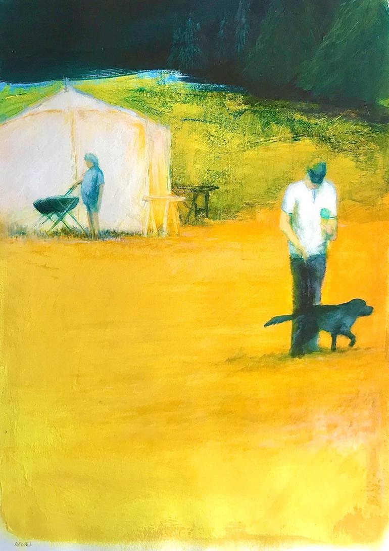 Delivered with a minimalist white mat , ready to be framed for an 31,5 x 23,6 in ( 80 x 60 cm) frame dream-like scene with a grill and a man with his dog. what did the dog smelled ?