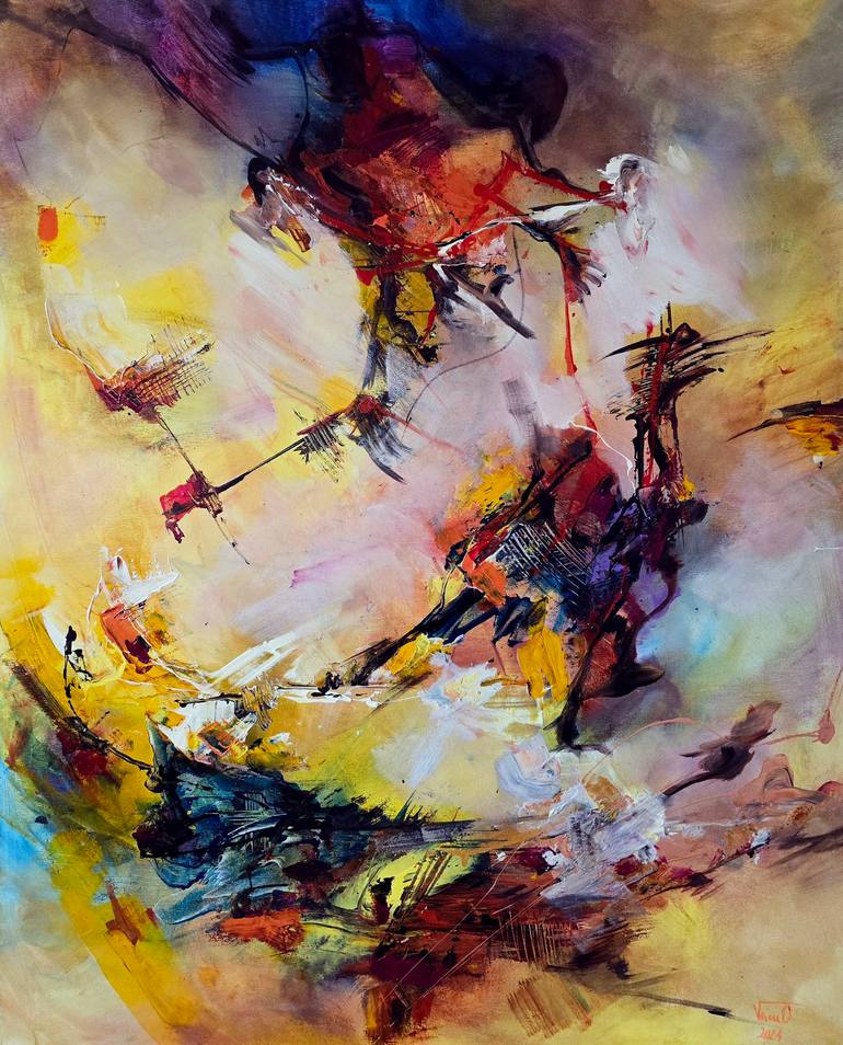 Lucrare originala în culori acrilice de cea mai buna calitate, pe panza. Culori predominante sunt rosu , galben orange. Lucrarea este semnata pe fata în dreapta jos și pe spate.Lucrare este pictata și pe margine ,numai fiind nevoie de rama.